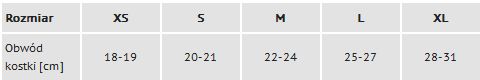 Przed zakupem należy zmierzyć obwód nogi w kostce i wybrać odpowiedni rozmiar według tabeli.