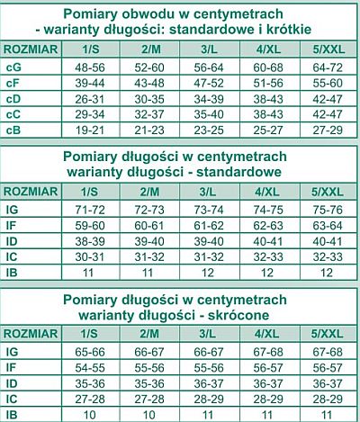 Podkolanówki dostępne są w rozmiarach: 1/S, 2/M, 3/L, 4/XL, 5/XXL, kolorach: beż naturalny, z palcami zamkniętymi lub otwartymi.