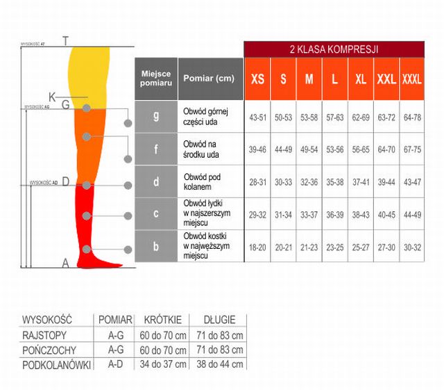 Aby dobrać odpowiedni rozmiar podkolanówek należy dokładnie zmierzyć w odpowiednich miejscach obie nogi, a następnie zapisane wielkości porównać z tabelą rozmiarów. Pomiaru dokonać rano zaraz po przebudzeniu.