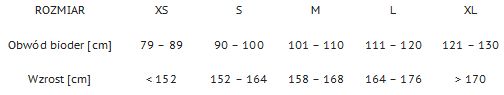 W celu prawidłowego doboru rozmiaru należy zmierzyć obwód bioder i wzrost, a następnie wybrać rozmiar z tabeli poniżej.